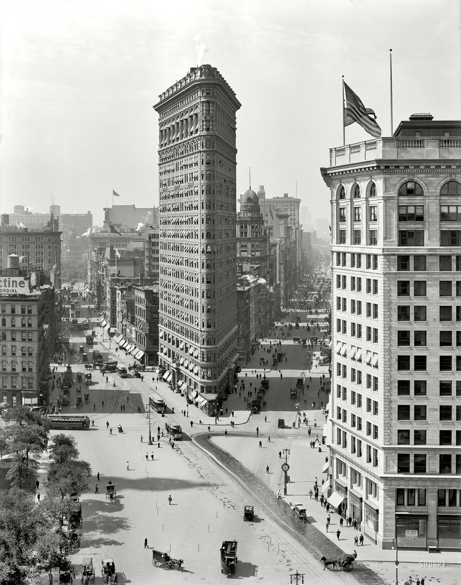 The Flatiron Building. The New York City skyscraper, The Flatiron, August 1909. The iconic building is bordered by Broadway on the left and Fifth Ave on the right. Detroit Publishing Company photo courtesy of Shorpy. (s/n/9146)
