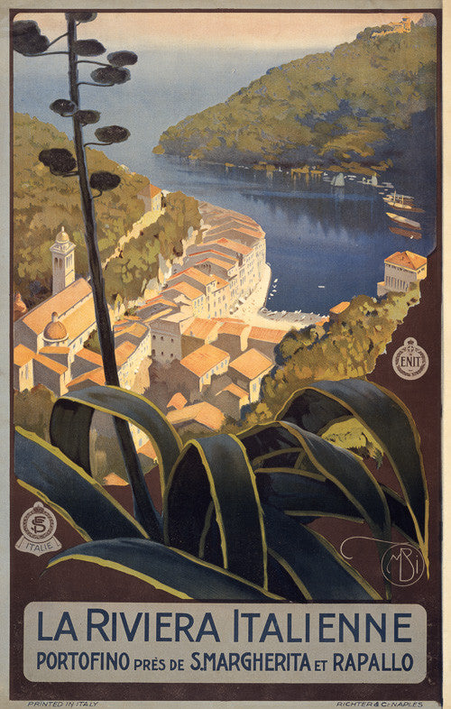 La Riviera Italienne. Portofino près de S. Margherita et Rapallo. The Italian Riviera. Portofino near Santa Margherita and Rapallo. Italian vintage travel poster, circa 1920. This poster shows the Italian Riviera at Portofino as viewed from a terrace above the coast.