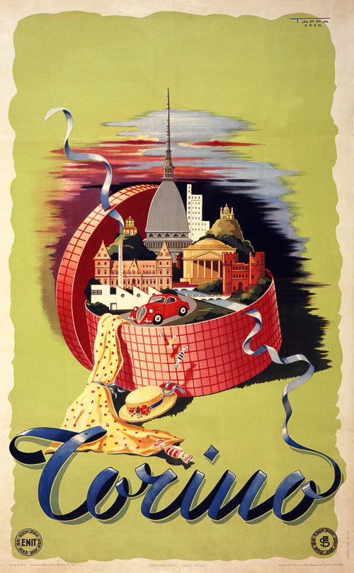Torino, Italy. The city of Turin, Italy sits in a bright hat box in this vintage travel poster, c. 1949.