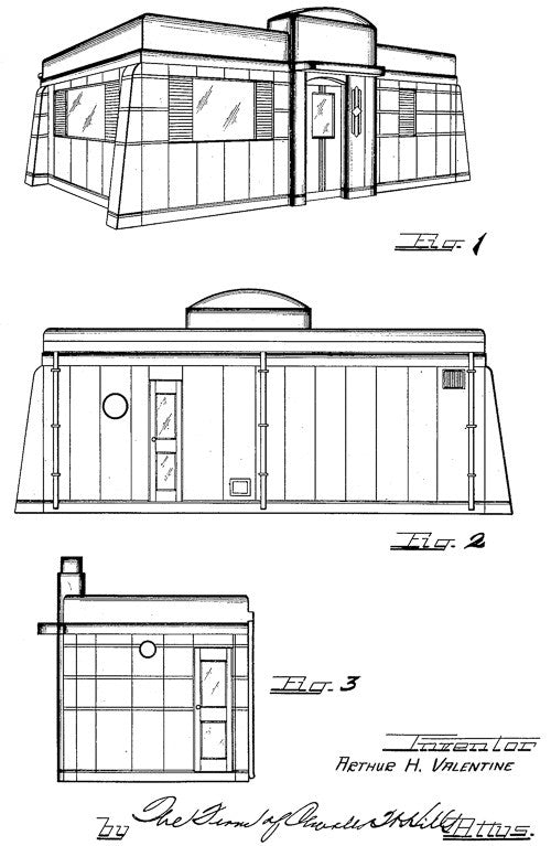 Valentine Diner patent drawing. Valentine Industries was known for its prefabricated diners. The patent for this diner describes it as a "Roadside Shop," though it's pretty clear it would be used as a small restaurant. This design could have been easily transported on the bed of a truck, like this. 1947. Invented by Arthur H. Valentine.