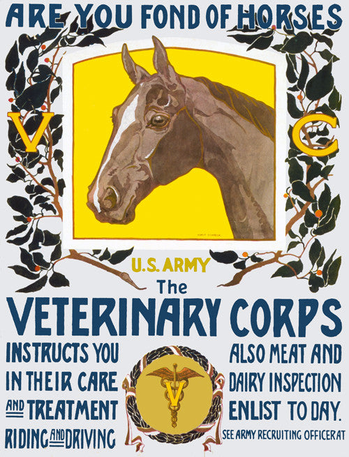 A WWI recruitment poster for the Army Veterinary Corps: 'Are you fond of horses. U.S. Army. The Veterinary Corps instructs you in their care and treatment, riding and driving. Also meat and dairy inspection. Enlist today. See Army recruiting officer.' Illustrated by Horst Schreck, 1919.