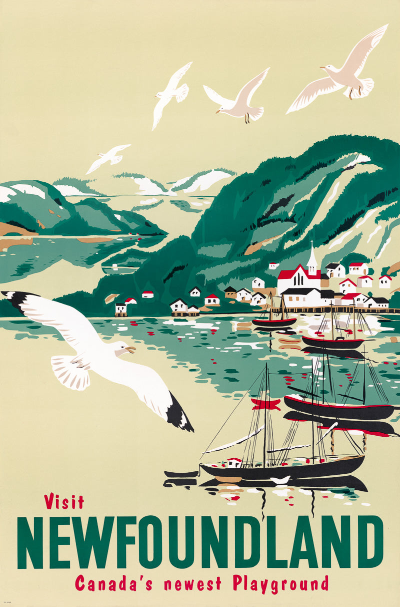 Visit Newfoundland: Canada's Newest Playground. Sailboats sit in a harbor in Newfoundland, Canada in this vintage travel poster. Circa 1950s.