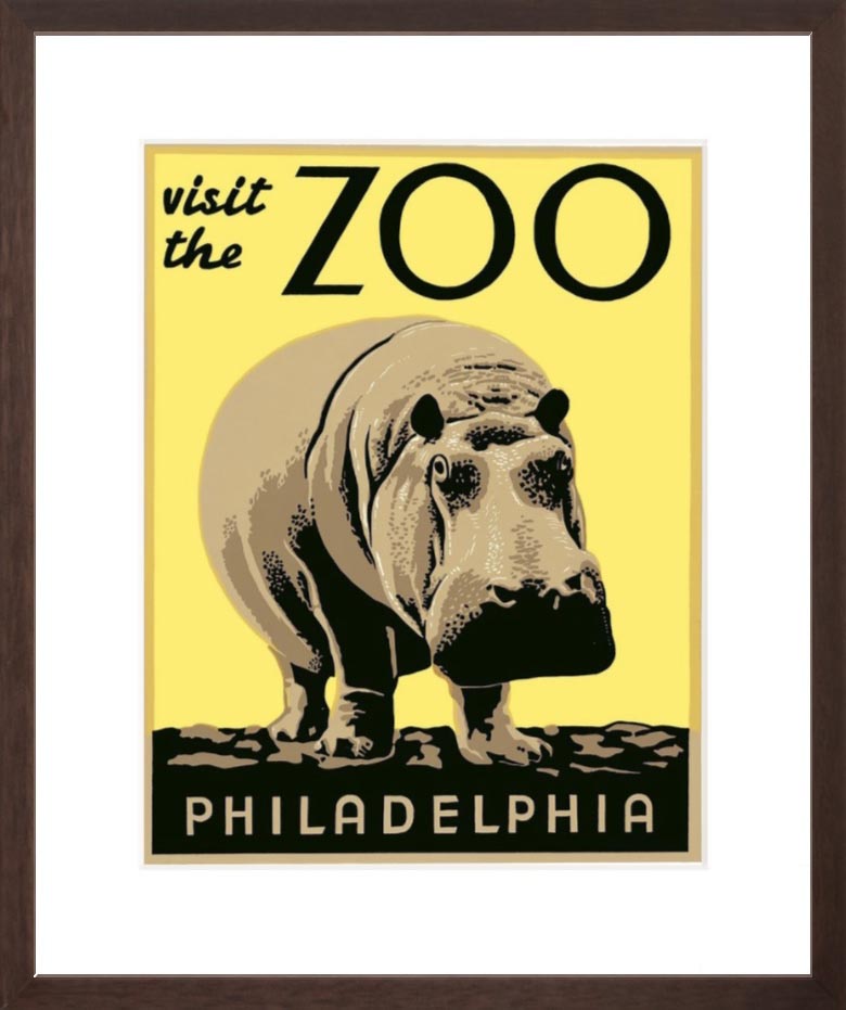 Visit the Zoo: Philadelphia poster. From the WPA Federal Art Project in Philadelphia, a hippopotamus marketing campaign: Visit the Zoo. Vintage Visit the Zoo poster. The original was in created with woodblock, circa 1936.