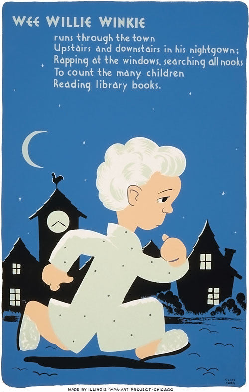 Created by the Illinois WPA Art Project to promote the use of libraries by children, this poster shows a child in pajamas running through town at night: 'Wee Willie Winkie runs through the town, upstairs and downstairs in his nightgown; rapping all the windows and, searching all the nooks to count the many children reading library books.' The poster was illustrated by Cleo Sara, c. 1940.