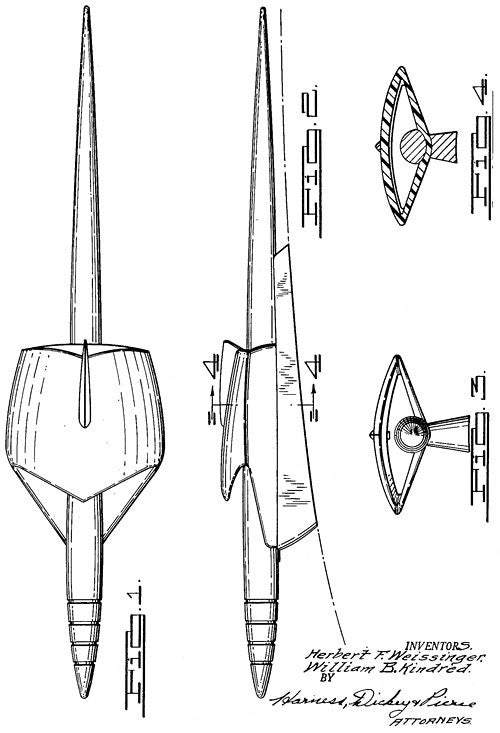 A hood ornament design by Herbert F. Weissinger and William B. Kindred that was assigned to the Kaiser-Frazer Corporation. The patent was issued in 1951.