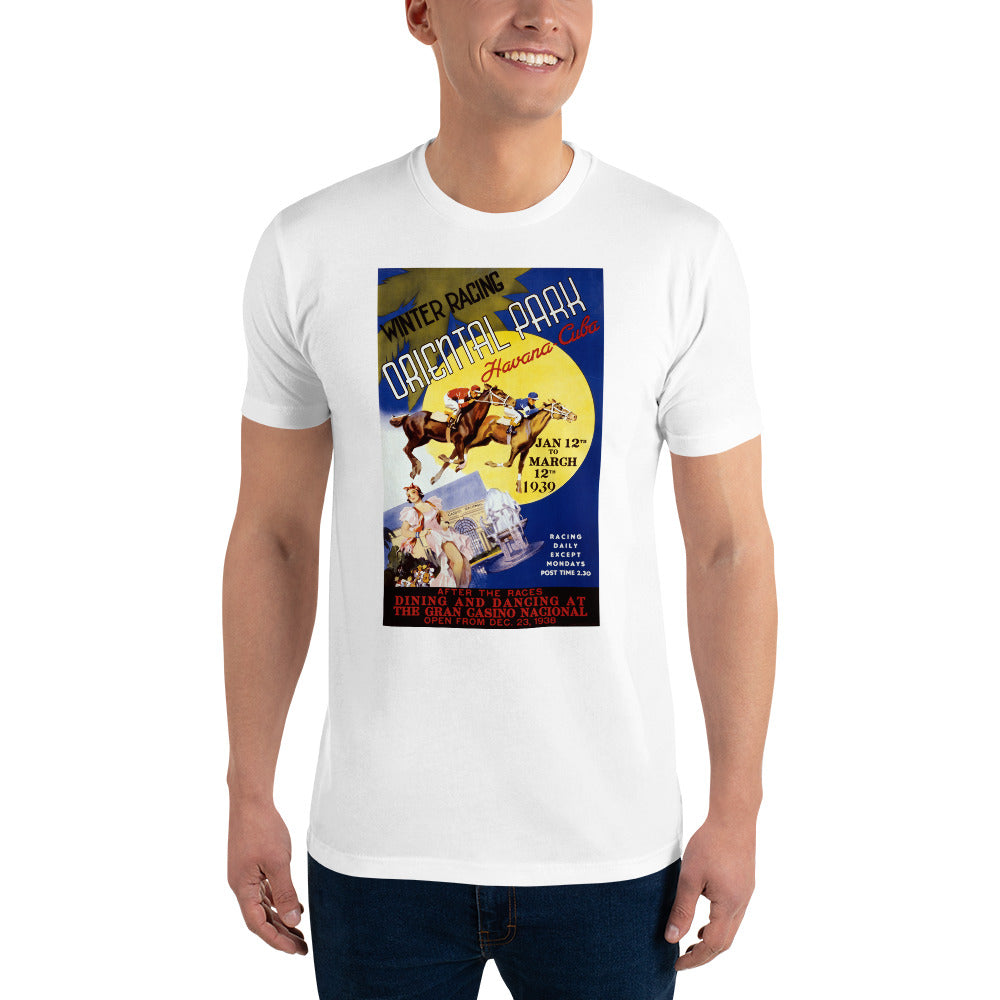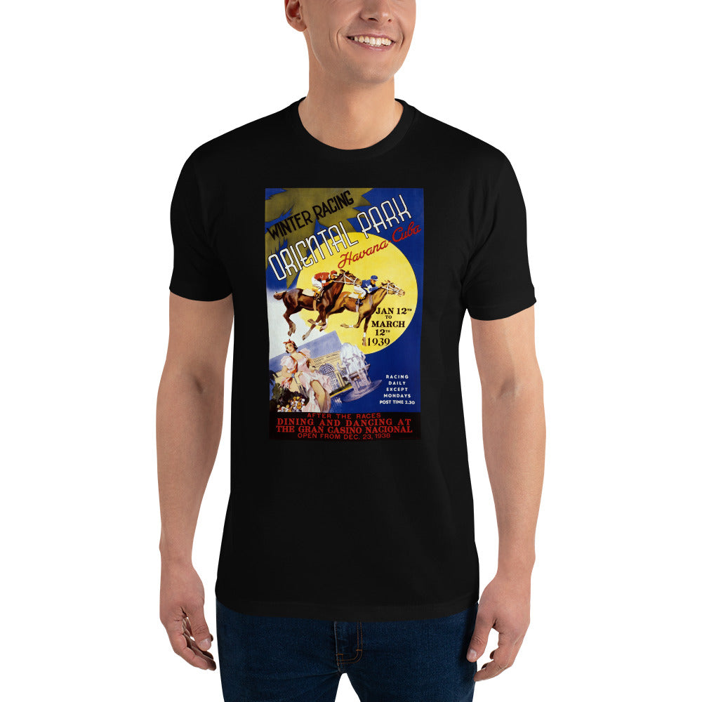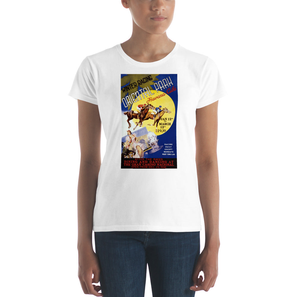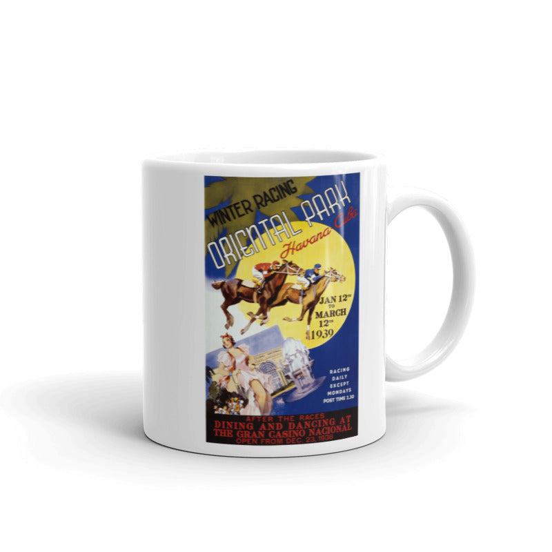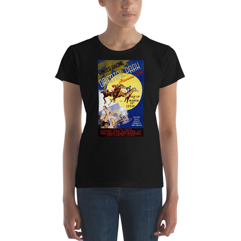 Winter racing, Oriental Park - Havana, Cuba. Vintage 1930s Cuban travel poster showing race horses at Oriental Park and a band and dancer at the Gran Casino Nacional in Havana, Cuba. "After the races, dining and dancing at the Gran Casino Nacional, open from Dec. 23, 1938."