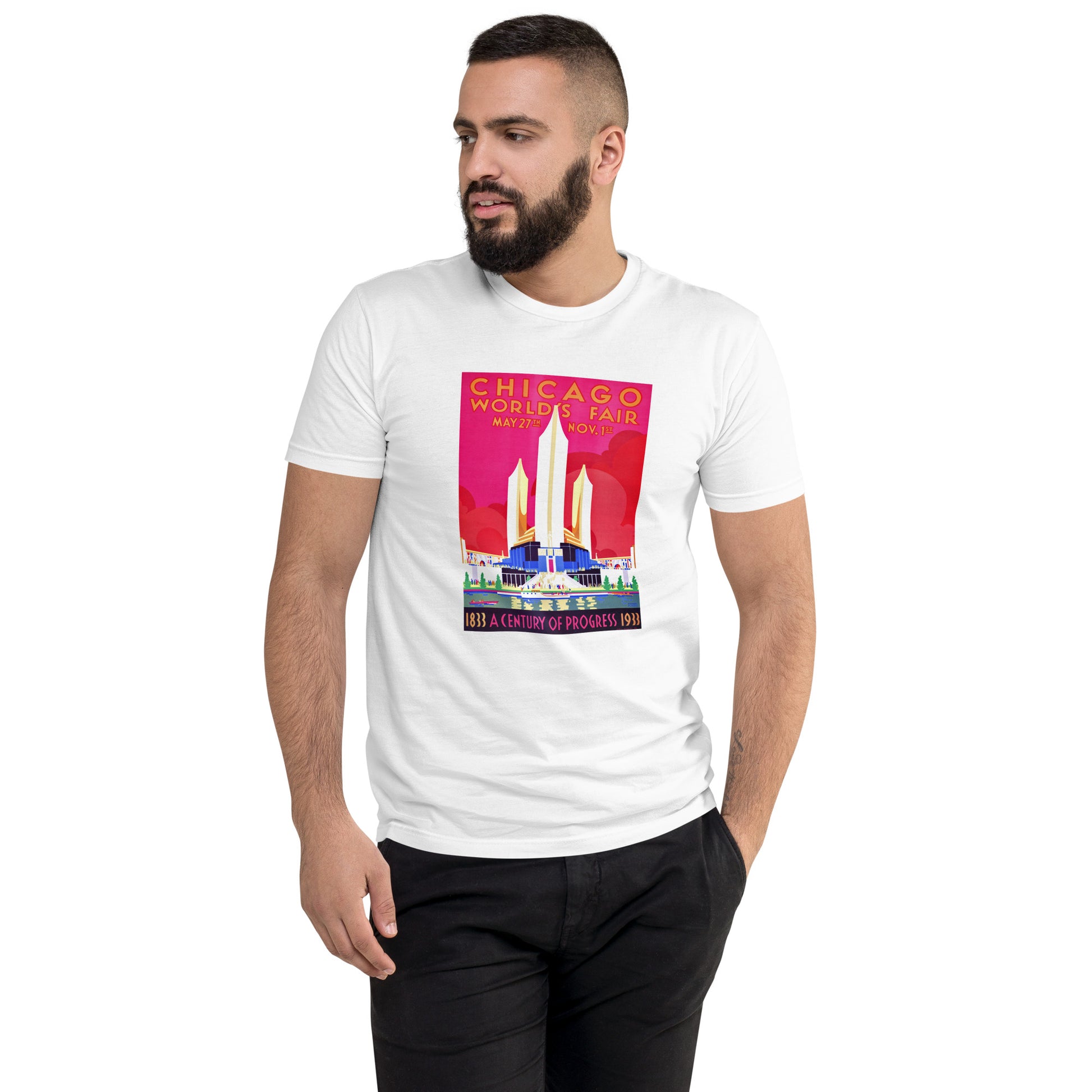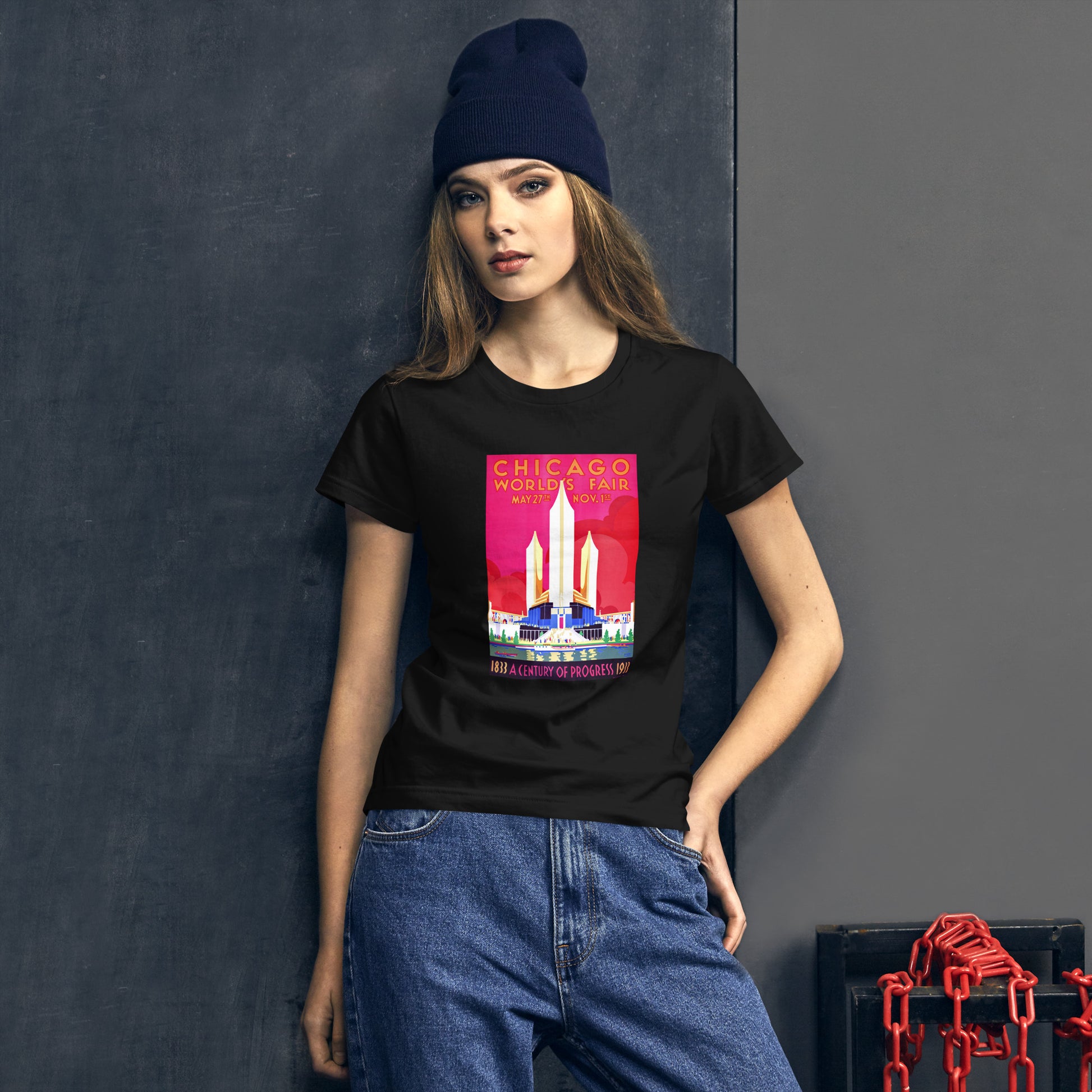 This poster was created for the 1933 Chicago World's Fair. The Chicago World's Fair Century of Progress Exposition of 1933 was held to celebrate the city's centennial and was built around a theme of technological innovation. The fair's motto was: "Science Finds, Industry Applies, Man Conforms."
