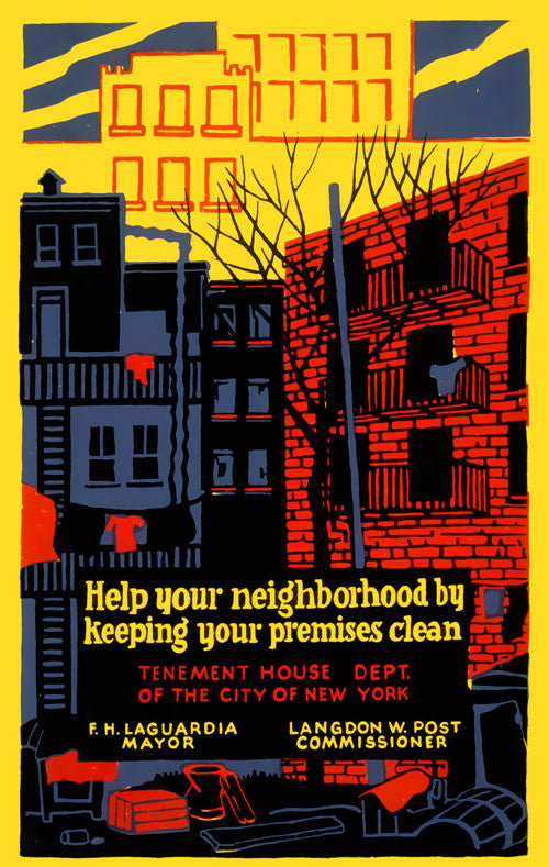 This poster was created for the Tenement House Dept. of New York City to promote cleanliness in public housing, c. 1936. 'Help your neighborhood by keeping your premises clean Tenement House Dept. of the City of New York : F.H. La Guardia, Mayor : Langdon W. Post, Commissioner.' Illustrated by the WPA Federal Art Project.