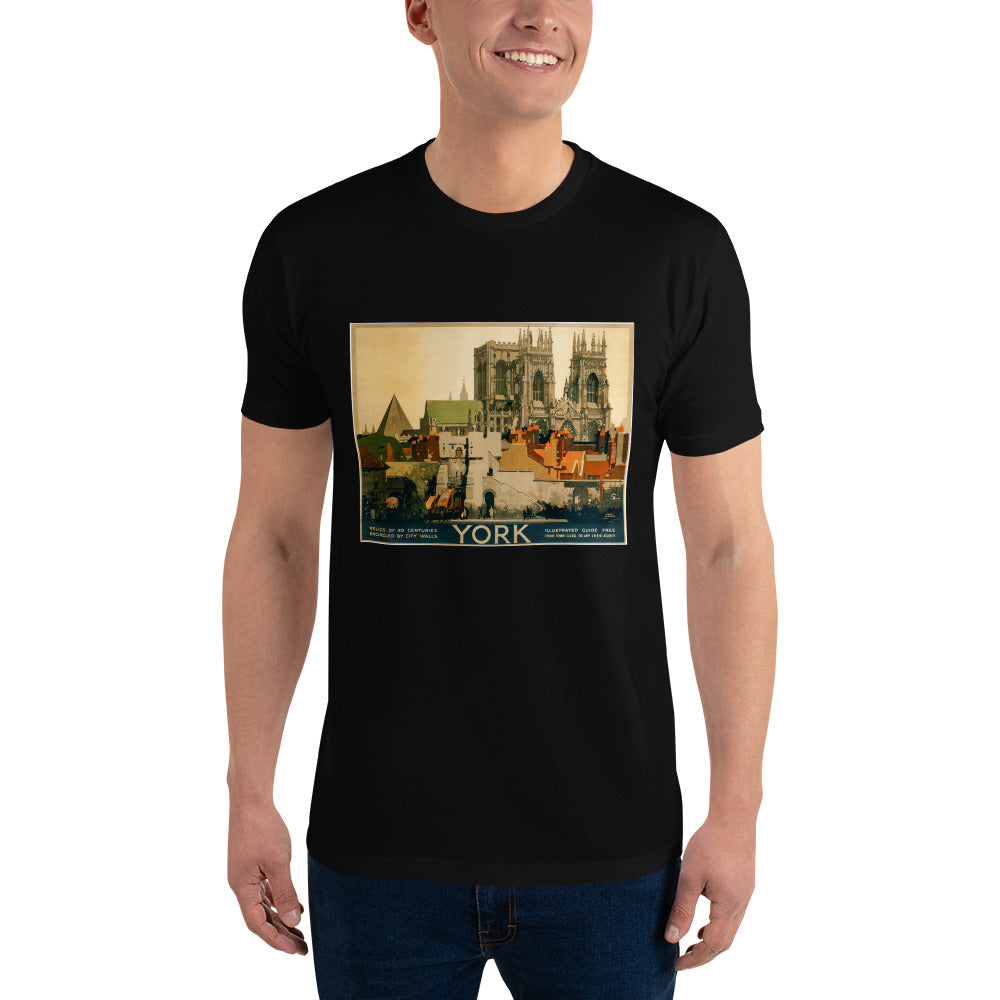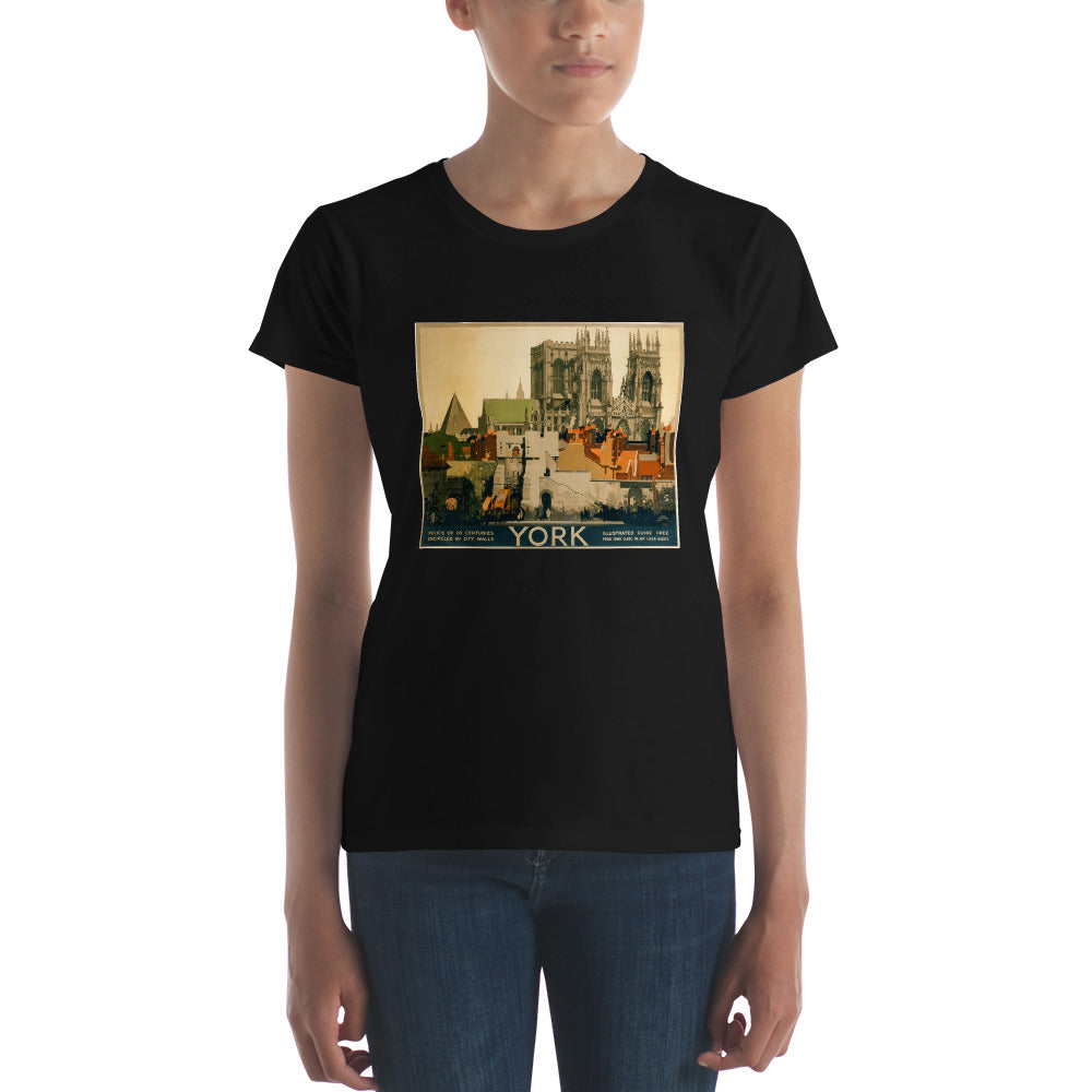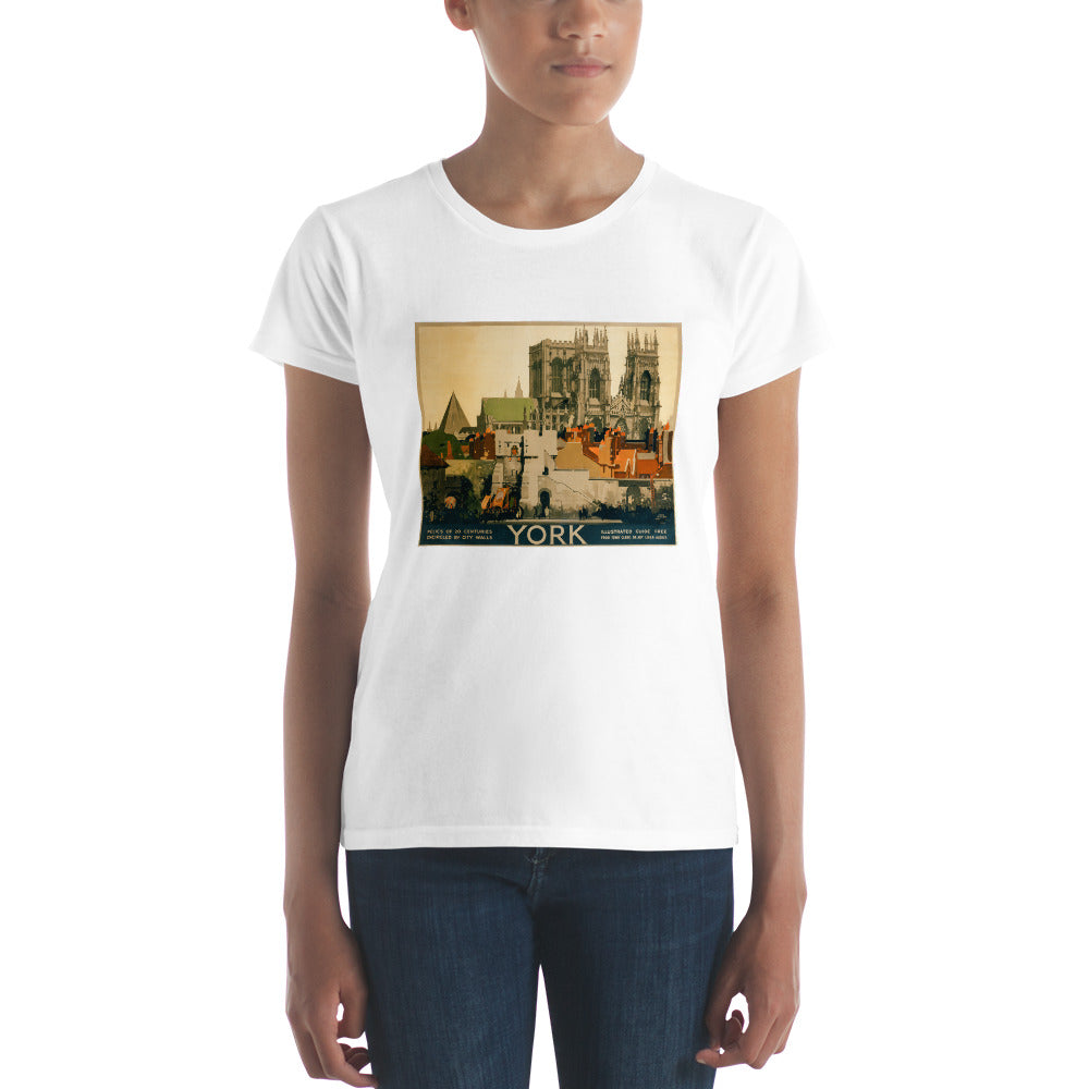 York: Relics of 20 centuries encircled by city walls. Vintage rail travel poster for York, England featuring York Minster Cathedral rising above the city walls. Illustrated by Fred Taylor, circa 1920. "Illustrated guide free from town clerk, or any L.N.E.R. agency."